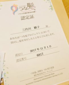 以前に行ったヘアドネーションの認定証が届きました。